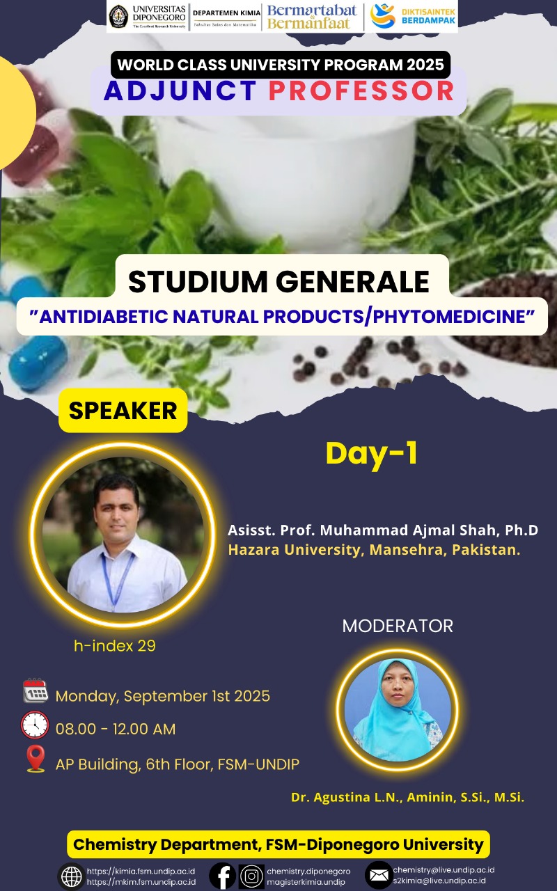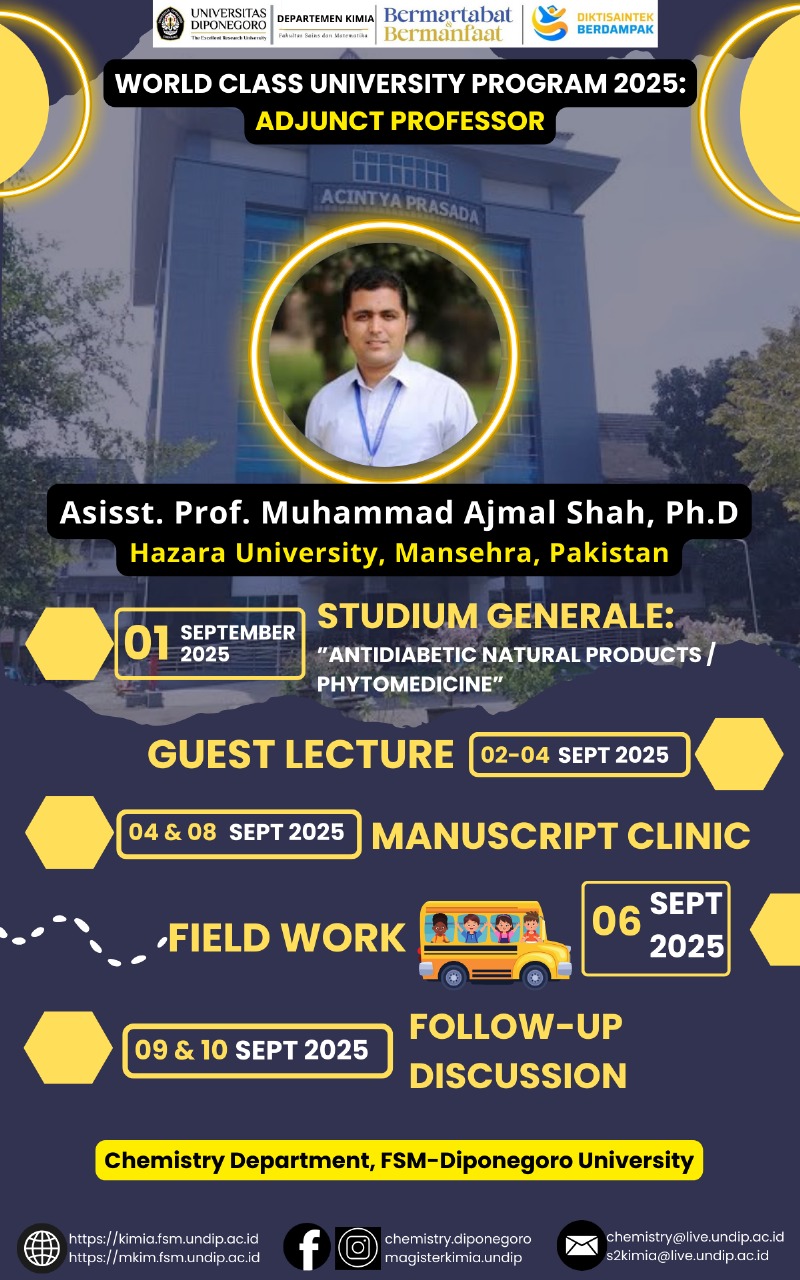 Departemen Kimia, Fakultas Sains dan Matematika Universitas Diponegoro menyelenggarakan kegiatan Adjunct Professor Program 2025 bersama Asisst. Prof. Muhammad Ajmal Shah, Ph.D dari Hazara University, Mansehra, Pakistan.