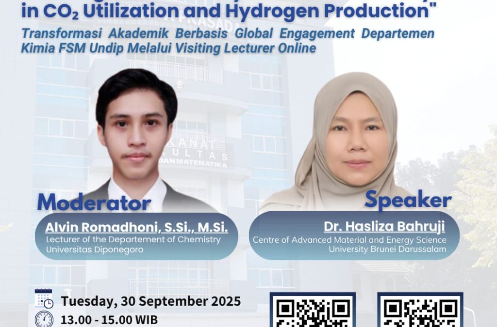 π’ The Department of Chemistry, Universitas Diponegoro, warmly invites you to join the *Visiting Lecturer Webinar on catalysis and photocatalysis in COβ utilization and sustainable hydrogen production.*